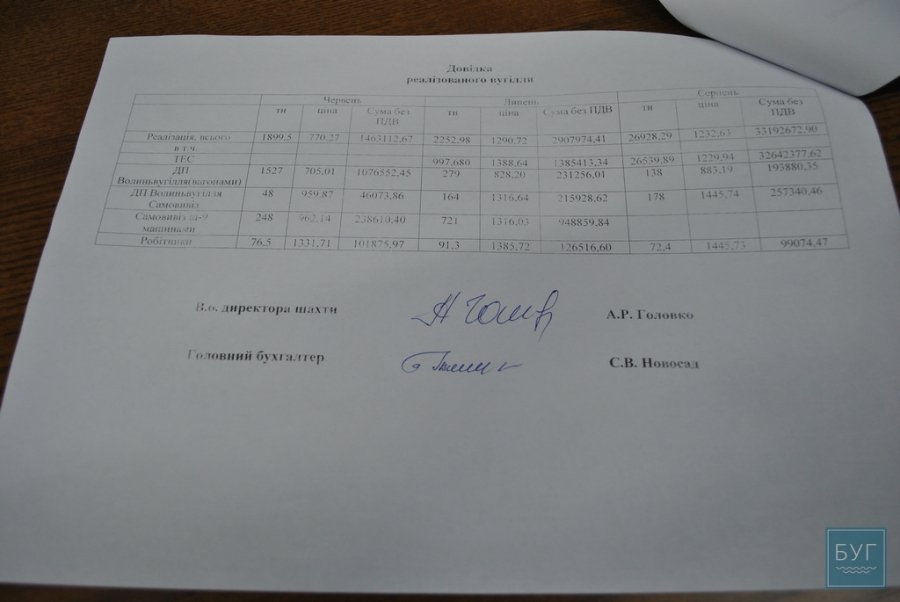Є розбіжності в підрахунках, які здійснювались адміністрацією шахти. Зокрема, за серпень місяць реалізовано 138 тонн вугілля за ціною 883.19 гривень за тонну. В сумі це 121880.22 гривень. Однак у офіційній відповіді керівника це число становить 193880, 35 гривень, тобто більше на 72 тисячі гривень. Де ділись більше 70-ти тисяч, куди їх “списали” і чому не вказана реальна вартість вугілля ніхто не знає. Невже керівництво вугільного підприємства не очікувало, що хтось візьметься перераховувати числа?