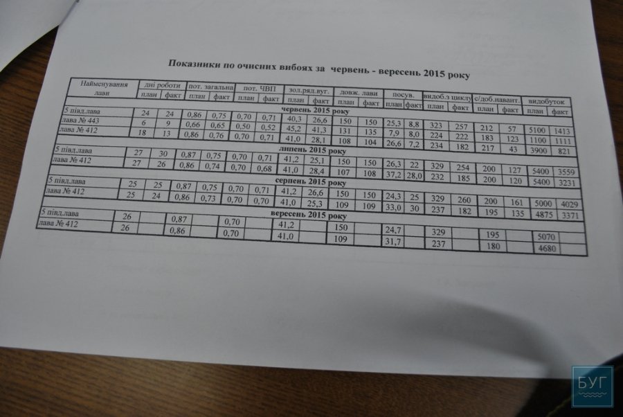 У документі зазначається, що за кошти від реалізації планувалося обладнати лави №412 та 414 комплексним механізованим кріпленням КД-80 та комбайном 1К-1о1, але в наявності на даний час ніякого комплексу, ані комбайну на шахті нема.