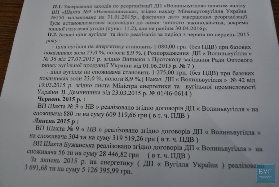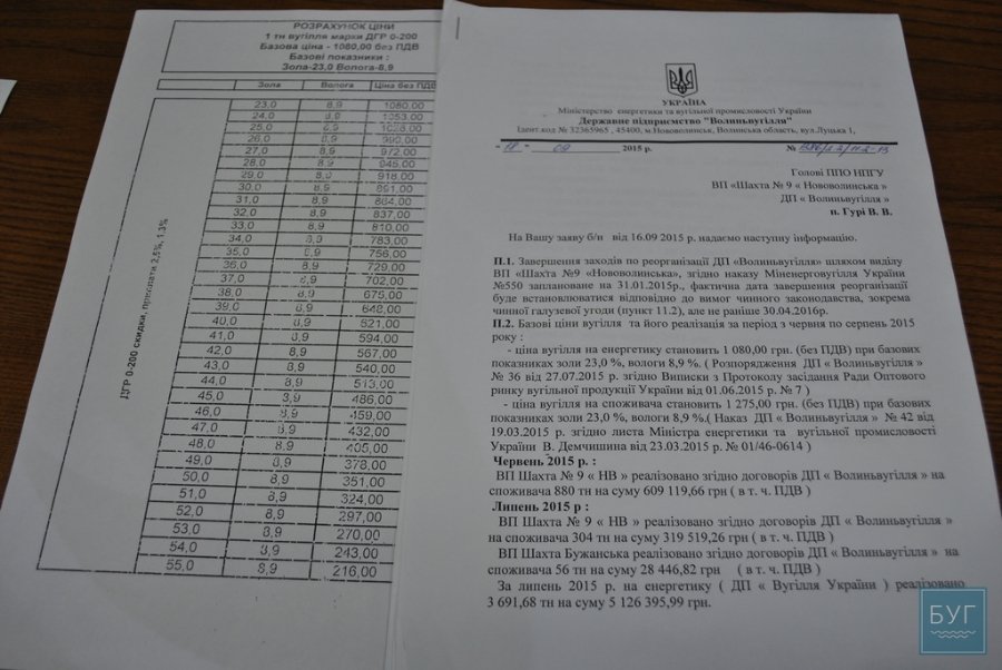 На запит голови профспілкової організації нововолинської шахти №9 Василя Гури, що стосувалися питань реалізації вугілля, його зольності, плану, витрат коштів ДП “Волиньвугілля” тощо, керівник Анатолій Головко “відзвітувався”, надавши йому відповідні документи.