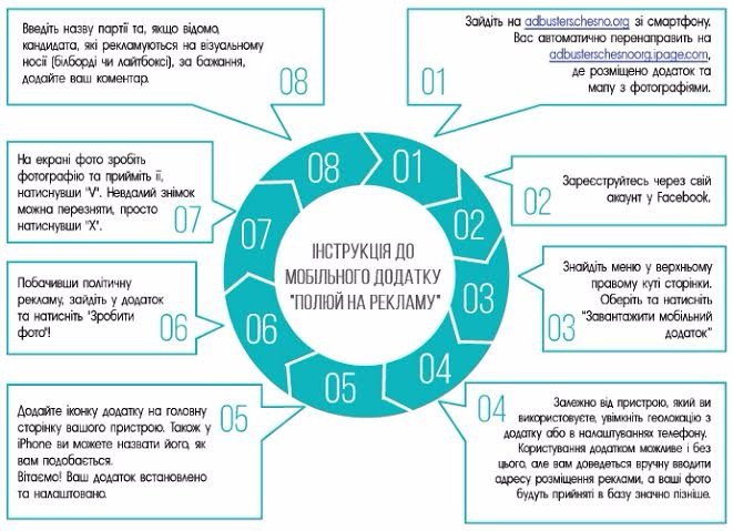 Щоб скористатись додатком, потрібно спершу перейти зі смартфону на http://adbusters.chesno.org. Далі користувача автоматично перенаправить на https://adbusterschesnoorg.ipage.com, де розміщено додаток та мапа з фотографіями. Після того: