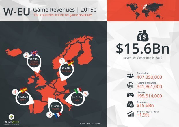 У цілому західний ринок європейські гри досягне $15.6 млрд. Європейський ринок росте кожен рік приблизно на 1,9%.
