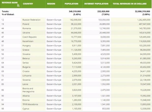 У Східній Європі по заробітках на відеоіграх в лідерах Росія, Польща та Румунія. Україна займає четверте місце по доходах.