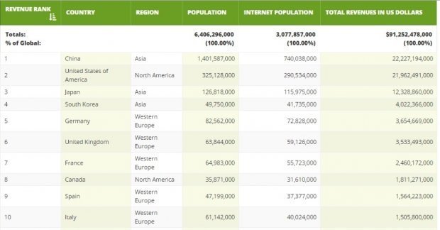 Хоча цифри приблизні, рейтинг є показником того, в яких країнах найбільше грошей на ігри. Оцінка доходу — прогнозна величина за підсумками 2015 року.