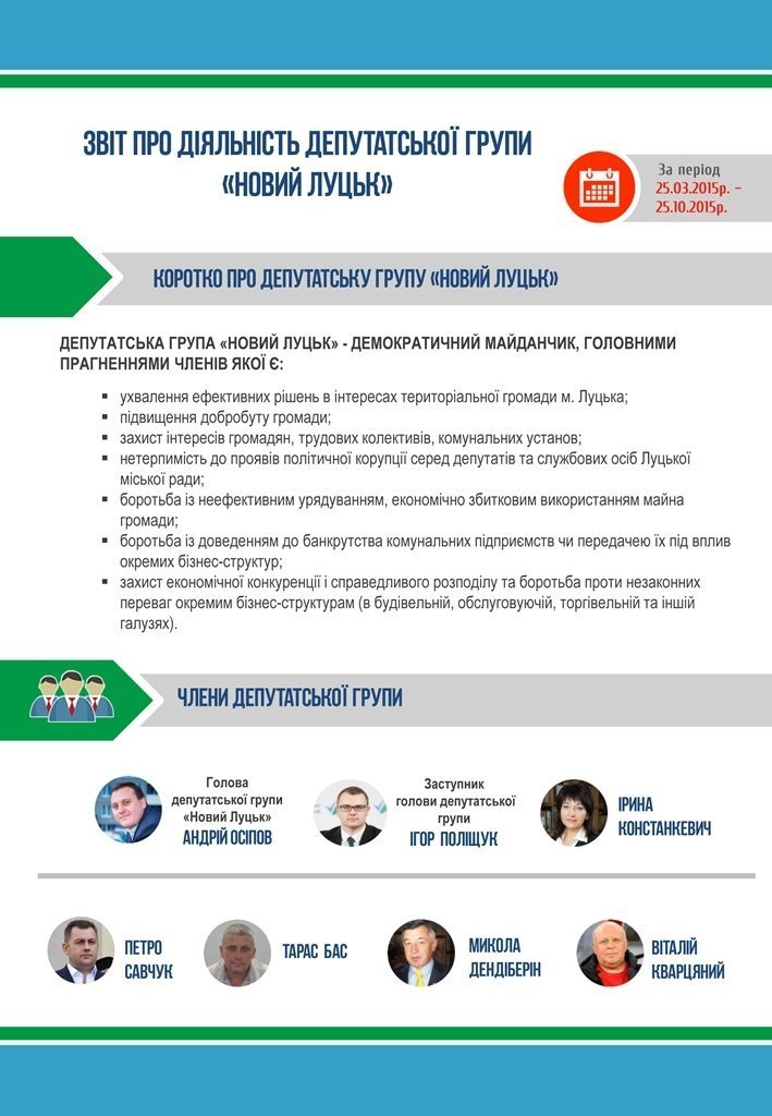 Нагадаємо, нещодавно група «Новий Луцьк звітувала про свою роботу за 2015-й рік. За цей час депутати об’єднання брали участь у виїзних комісіях, проводили зустрічі з виборцями на округах, подавали запити, підготували 28 проектів рішень на засідання сесії Луцькради та чотири проекти на виконком.