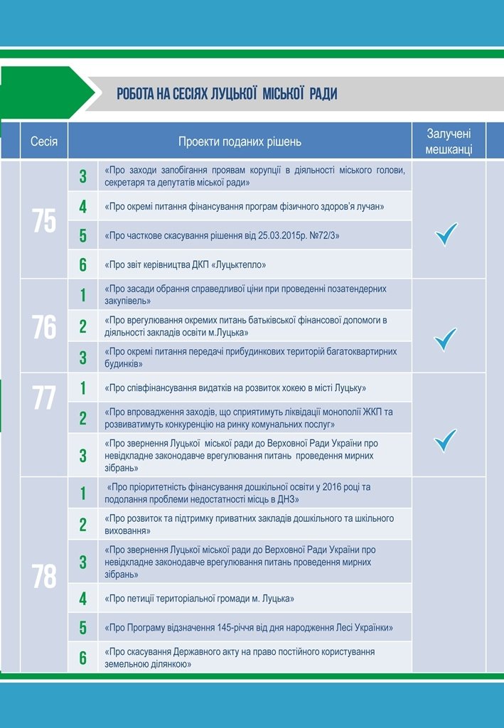 Крім того, під час сесійних засідань траплялися випадки, коли не підтримували наші ініціативи. А все - тому, що більшість депутатів перебувають під впливом Луцького міського голови Миколи Романюка - у більшості через те, що працюють керівниками комунальних установ чи в міськраді, частина депутатів мають родичів, які займають якісь посади у виконавчих органах міської ради, і є ті, хто отримує блага й безпосередньо залежить від Романюка. Зокрема, це можливість мати земельні ділянки, вигравати в тендерах тощо.