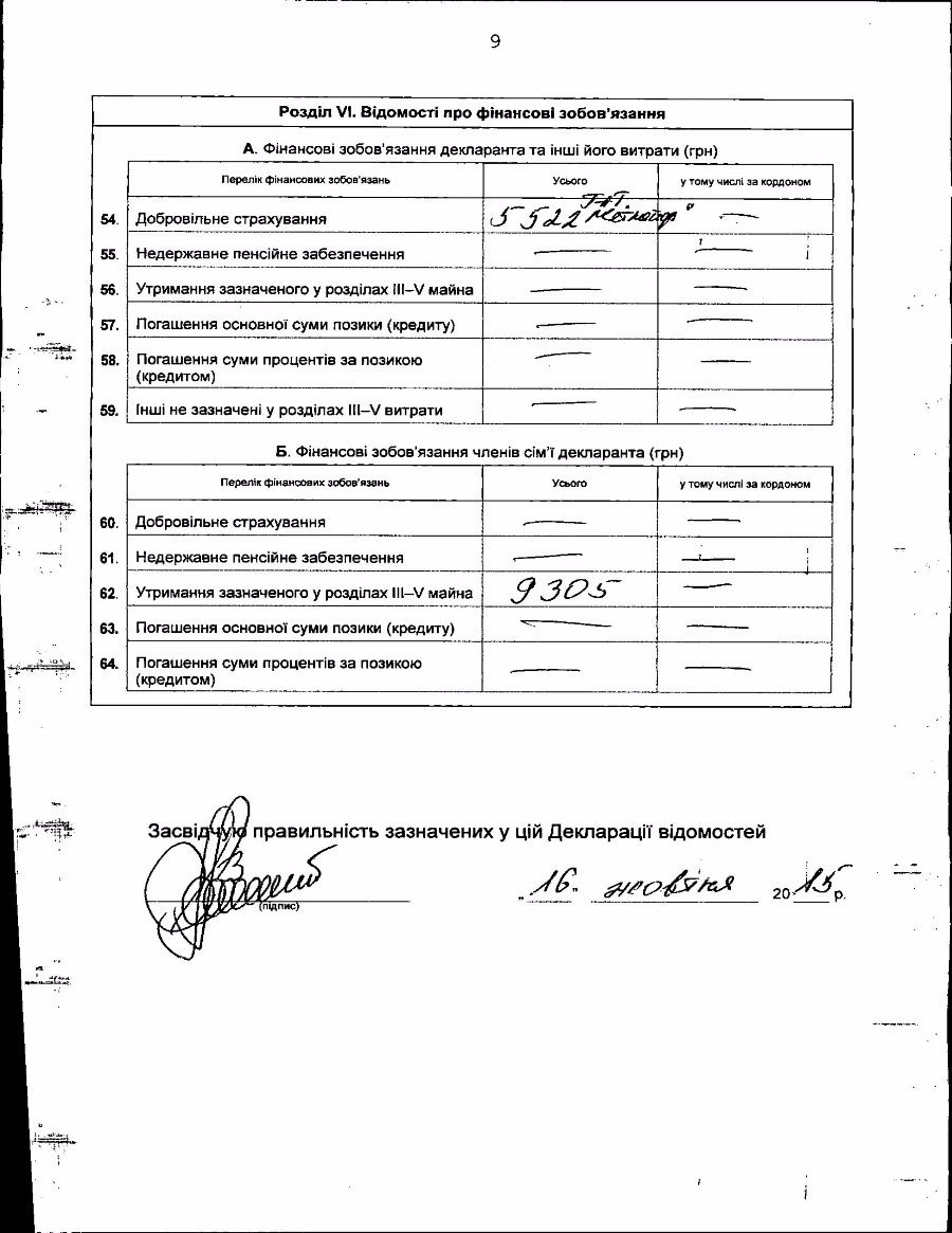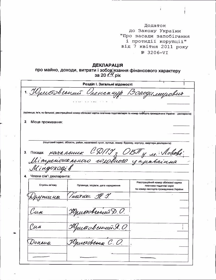 Доходи членів сім'ї Олександра Юристовського (дружина та двоє синів) у 2014 році склали трохи більше 60 тисяч гривень. Усе це - заробітна плата.