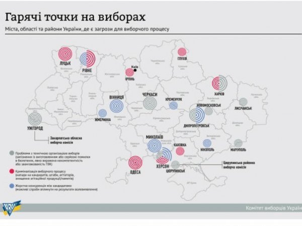 До "гарячих точок" були віднесені 20 міст, у яких спостерігалися проблеми з технічною організацією виборів, криміналізацією виборчого процесу та жорсткою конкуренцію між кандидатами, повідомляє прес-служба КВУ.