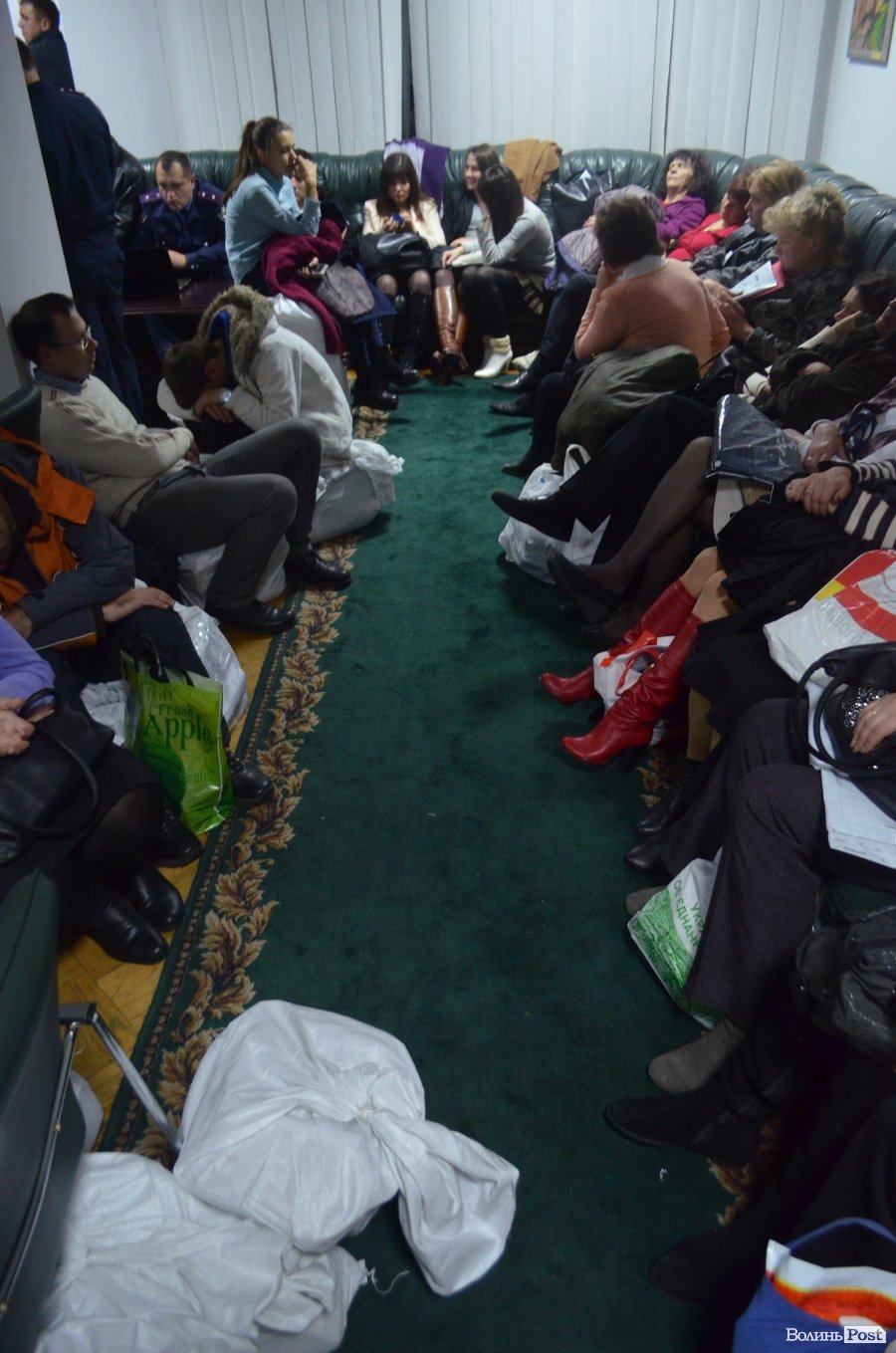 У Луцькій ТВК триває підрахунок голосів. Члени виборчих дільниць змушені чекати в холі, доки дійде їхня черга. Люди втомлені та знервовані, вже виникали сварки через місце у черзі.