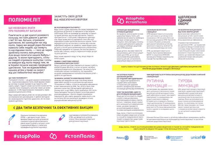 Довідково: Поліомієліт (поліо) – вірусне інфекційне захворювання, що уражує нервову систему і викликає повний параліч. Поліомієліт невиліковний, але його можна попередити за допомогою вакцинації. Зазвичай вірус інфікує дітей, які не вакциновані або не отримали всіх доз вакцини. У деяких випадках може вражати підлітків і дорослих, які не отримували щеплень. Вірус поліо є дуже заразним. Він може передаватися від дитини до дитини та інфікувати їх без жодних симптомів, поки не призведе до хвороби та паралічу. Нажаль, ліків від цієї хвороби не існує. Але їй можна ефективно запобігти за допомогою щеплення. Починаючи з 1988 року,кількість випадків інфікування в світі зменшилась на 99 %. У 2014 році було повідомлено тільки про 236 випадків інфікування в світі.