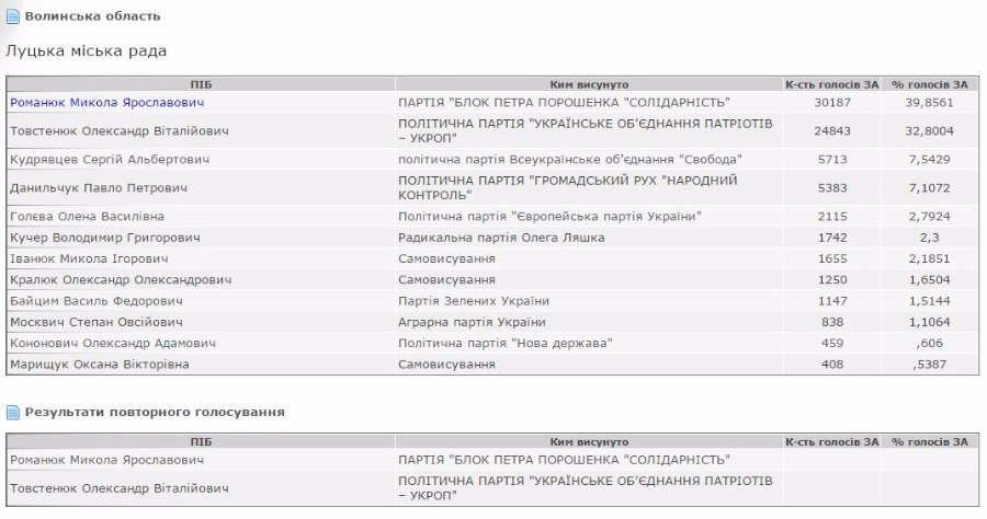 Лідирує на посаду Луцького міського голови попередній очільник міста Микола Романюк (30187 голосів, 39,8561%). Його основним конкурентом є Олександр Товстенюк - політична партія «Українське об’єднання патріотів – УКРОП» (24843 голосів, 32,8004%). Третім у перегонах за крісло мера став Сергій Кудрявцев - політична партія Всеукраїнське об’єднання «Свобода» (5713 голосів, 7,5429%).