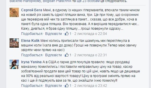Зокрема, люди скаржаться на те, що сперечатися з працівниками супермаркетів про те, що вони зробили якусь помилку (дописуючи зайвий товар чи поставивши не ту ціну) інколи майже безнадійно. Також одна користувачка ділиться досвідом США у вирішенні таких проблем, де працівники торгових закладів не сперечаються з покупцями, а навпаки - дякують за те, що їм вказали на помилку, яку вони зробили.