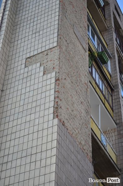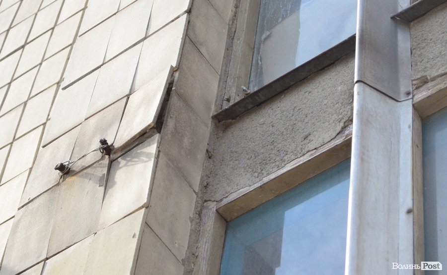 Від будинку на Театральному майдані Луцька відшаровується плитка і падає лучанам на голову.