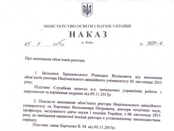Шановне товариство! Інформую Вас стосовно подій в Національному авіаційному університеті. Мною був звільнений ВО ректор...