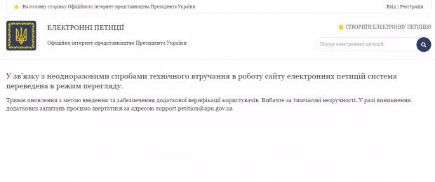 «У зв'язку з неодноразовими спробами технічного втручання в роботу сайту електронних петицій система переведена в режим перегляду. Триває оновлення з метою введення та забезпечення додаткової верифікації користувачів. Вибачте за тимчасові незручності», — зазначено в повідомленні.