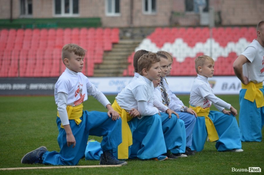 Після професійних футболістів, тренерів та їх підопічних на футбольне поле вийшли козаки з клубу бойового гопака «Герць», які продемонстрували глядачам елементи козацького бою.