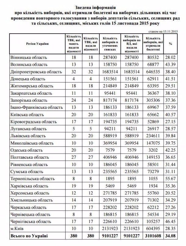 За даними, які опубіковані на сайті Центральної виборчої комісії, у другому турі місцевих виборів, що відбулися вчора, 15 листопада, взяла участь лише третина громадян України.