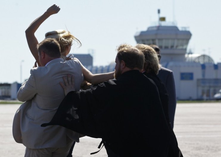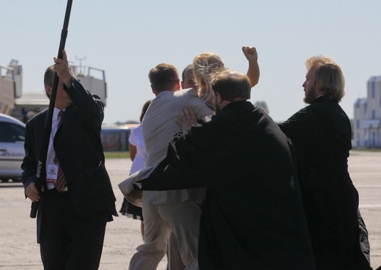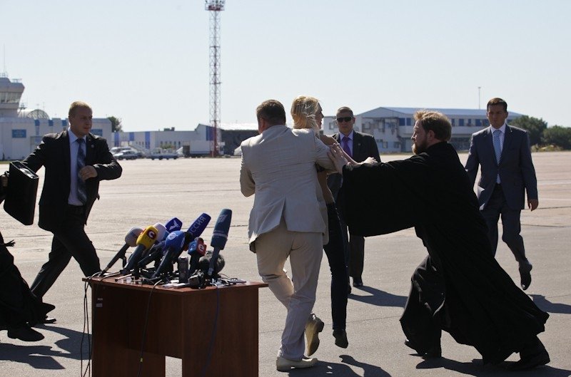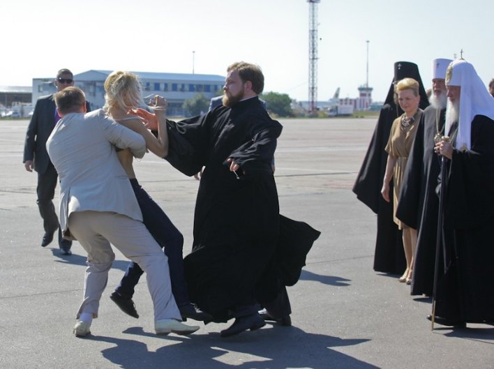 На патріарха Кирила в аеропорту Бориспіль напала напівгола активістка руху FEMEN Яна Жданова.