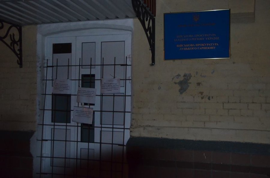 Так, зокрема, на табличках написано: "УВАГА!!! Військова прокуратура Луцького гарнізону Західного регіону України ЗАКРИТА, до припинення суду над Героями України!".