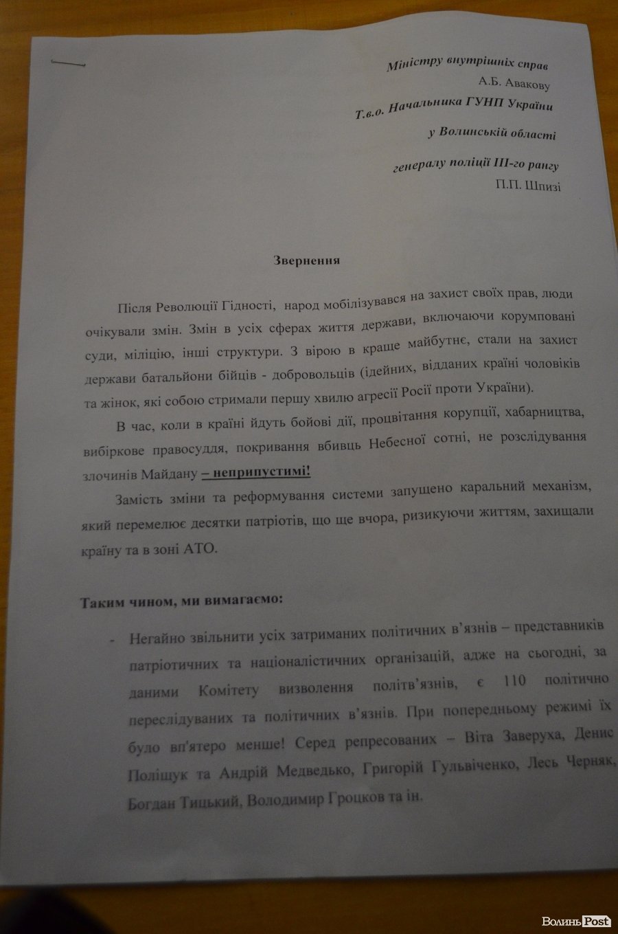 До пікетувальників вийшов в.о. начальника Головного управління Національної поліції у Волинській області Петро Шпига, до якого звернувся нинішній правозахисник, який довгий час працював у секторі карного розшуку Луцького міськвідділу міліції, Олексій Чайка. Він переконаний, що змін у структурі поліції не буде до тих пір, поки на посади призначатимуть ставлеників режиму Януковича або тих, які скомпрометували себе.