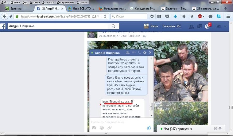 «Почав переглядати стрічку: багато постів, фотографії, але всі пости створені за останні дні і сам профіль недавно створений. Напружили фотографії з білою стрічкою на рукаві. На фотографіях різні люди. Послав пропозицію, що можу поповнити номер. У відповідь – краще прийшли коди. Питаю – № бригади? У відповідь – 24. Питаю – 24 Київська територіальної оборони або 24 Тернопільська? (обидва відповіді неправильні). Заминка. Починаю квапити – пише Тернопіль. Упевнений, що зараз такі повідомлення пішли від нього сотнями, також упевнений, що таких профілів багато. Зараз листуюся дізнаюся куди три тонни тушонки вислати …» – пише користувач.