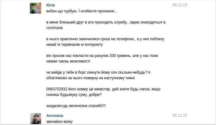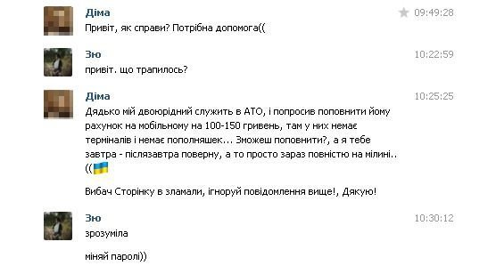 Ось одне з таких повідомлень: «Дядько мій двоюрідний служить в АТО, і попросив поповнити йому рахунок на мобільному на 100-150 гривень, там у них немає терміналів і немає пополняшек… Зможеш поповнити?, а я тебе завтра – післязавтра поверну, а то просто зараз повністю на мілині..».
