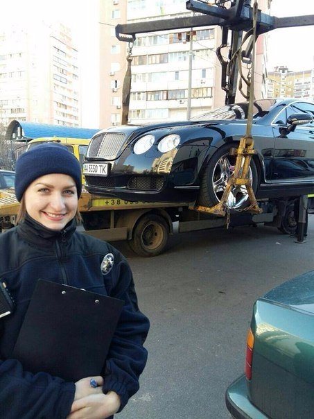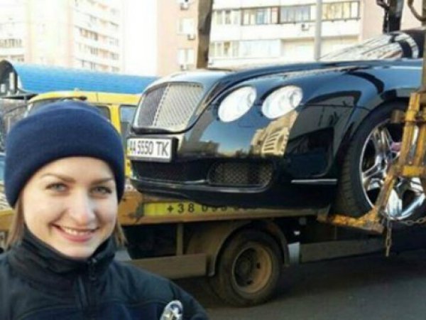 У мережі активно поширюють фотографію, на якій усміхнена співробітниця патрульної поліції зображена на фоні евакуації за неправильну парковку мажорного автомобіля Bentley.