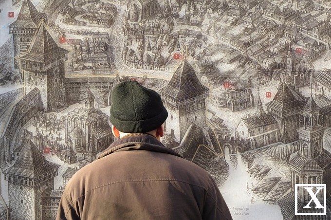 Таблиця одразу привернула увагу перехожих, які уважно розглядають малюнок. Об’єкти замкової забудови позначені і виведені у список поряд з реконструкцією.