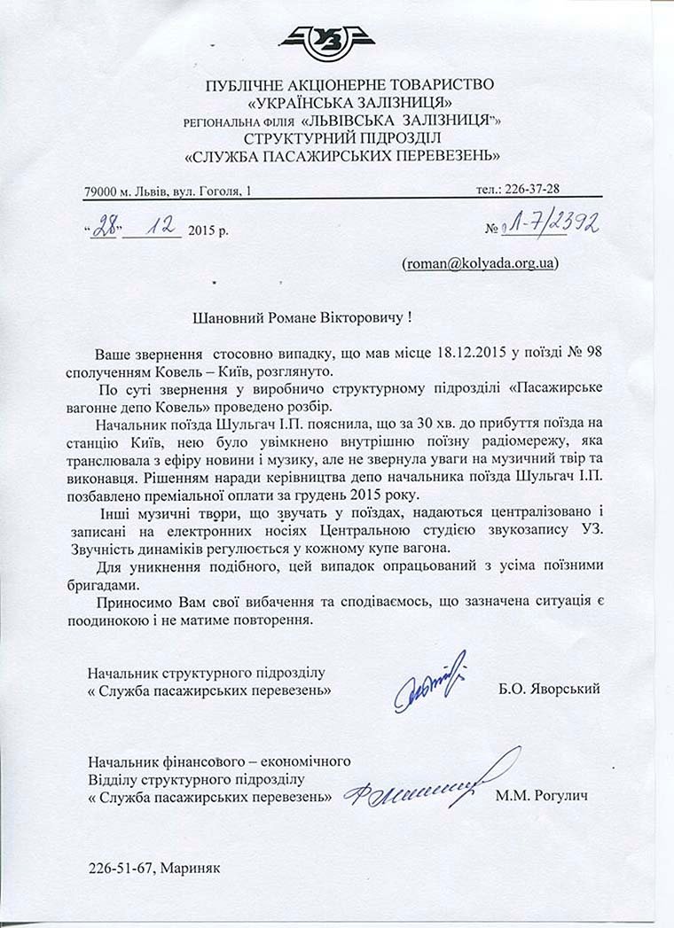 Днями музикант отримав офіційну відповідь керівництва структури, де йому повідомили, що начальника потяга за увімкнення цього музичного твору, який не входить у записані централізовано у студії звукозапису «УЗ» збірники, позбавили премії за грудень.