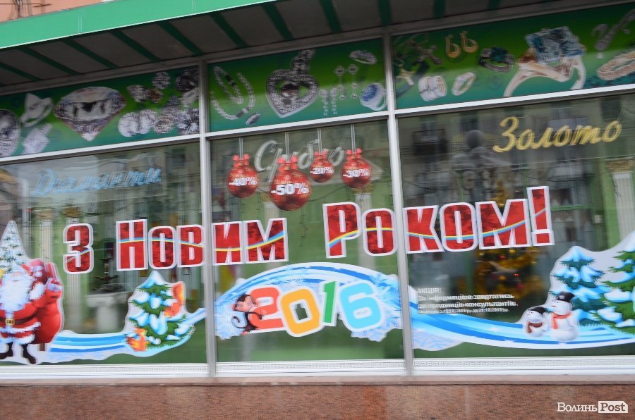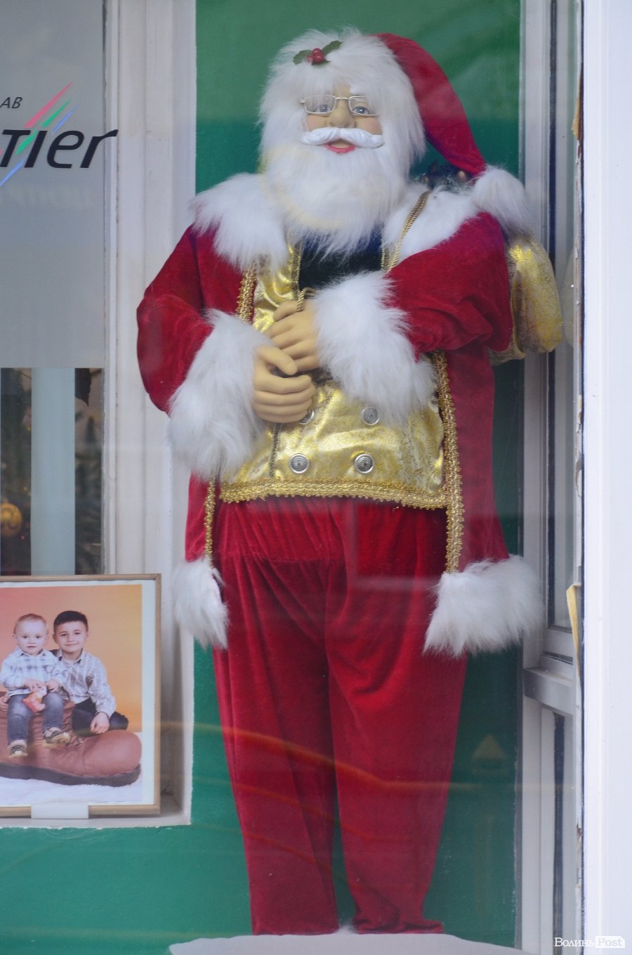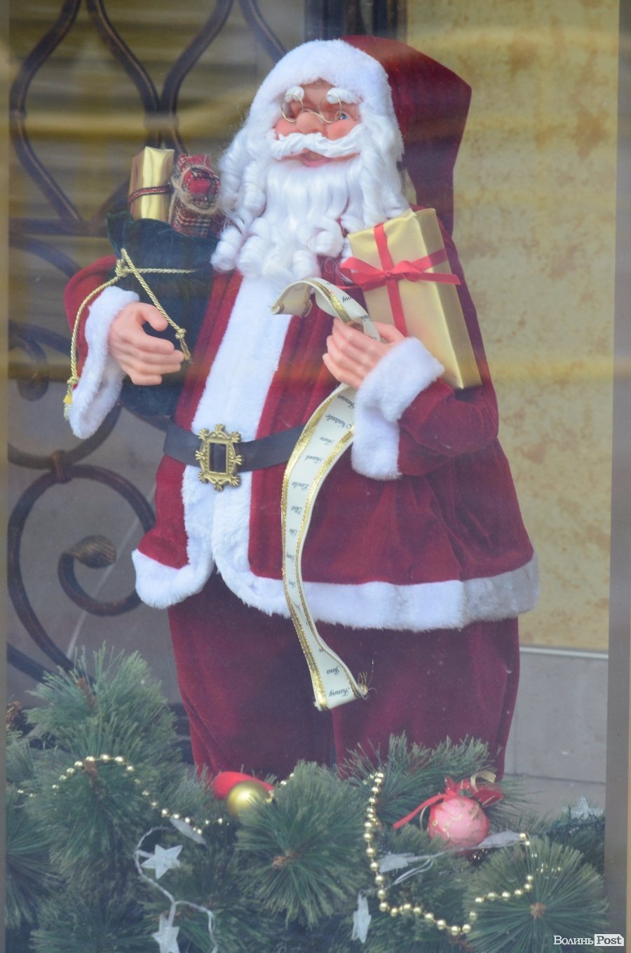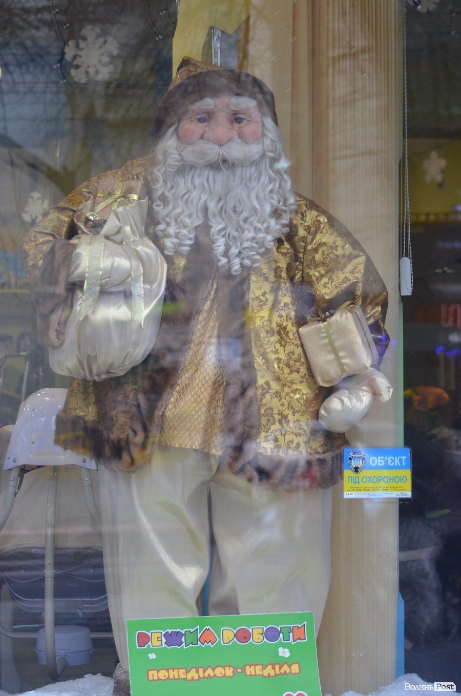 Місцеві магазини теж вирішили долучитися до святкового прикрашання, але вони зробили ставку на фігури Діда Мороза, які дивляться на перехожих з вітрини ледь не кожного магазину.