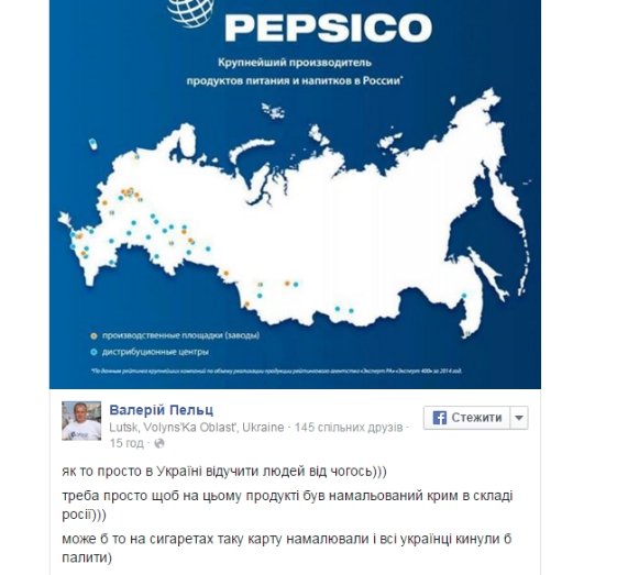 Наразі над кримом майорять триколори РФ а не Жовтоблакитний прапор України. Тому не бачу ніяких причин банити кока-колу. Вони ж сказали що до політики діла не мають. А факт залишається фактом. І ЧОГО ВИ ВСІ ПРИЧЕПИЛИСЬ ДО ТОЇ КОКА-КОЛИ І ВИ Ж ВСІ ЇЇ ТАК АКТИВНО ОБСИРАЄТЕ......... ВАМ ХІБА НЕ ПОФІГ МАЄ БУТИ????? ЛОХАМИ БУЛИ, ЛОХИ Є І ЛОХАМИ ОСТАНЕТЕСЬ. НЕ ЗАБУДЬТЕ НА НАСТУПНИХ ВИБОРАХ ЗА ЗАЙЧИКА ПРОГОЛОСУВАТИ.........