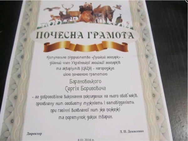 Сторож Луцького зоопарку отримав грамоту за порятунок тварин під час пожежі.