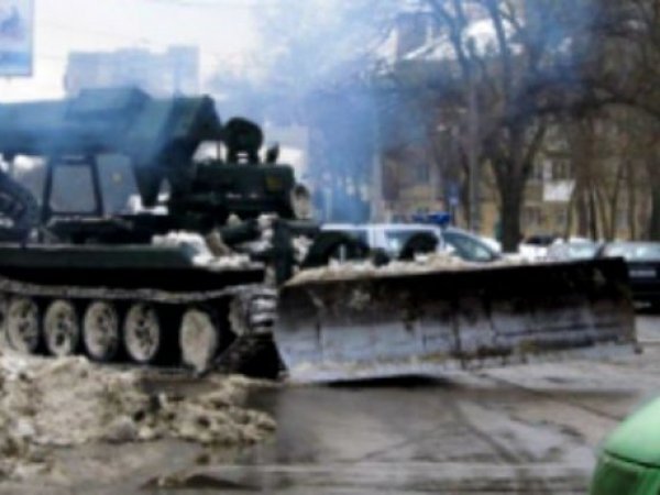 Через сильні снігопади на дороги Харкова допомагати снігоприбиральним машинам підтягнули військову техніку.