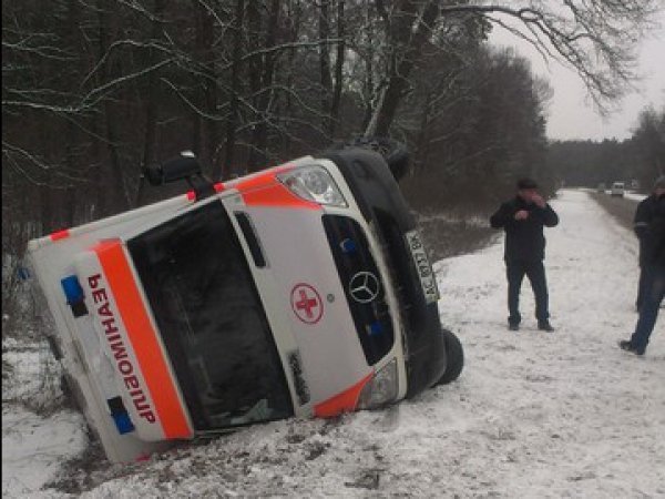 На трасі Луцьк-Маневичі автівку занесло через нерозчищену дорогу, внаслідок чого перевернувся «Реанімобіль», який прямував з Луцька.