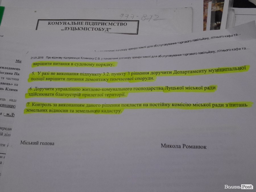 Термін оренди збіг, тож депутати Луцькради взялися обстежувати ділянку та з’ясовувати, чи продовжувати підприємцю договір оренди, чи ні. 20-го січня під час засідання постійної комісії міської ради з питань земельних відносин і земельного кадастру депутати вирішили договір оренди не продовжувати.