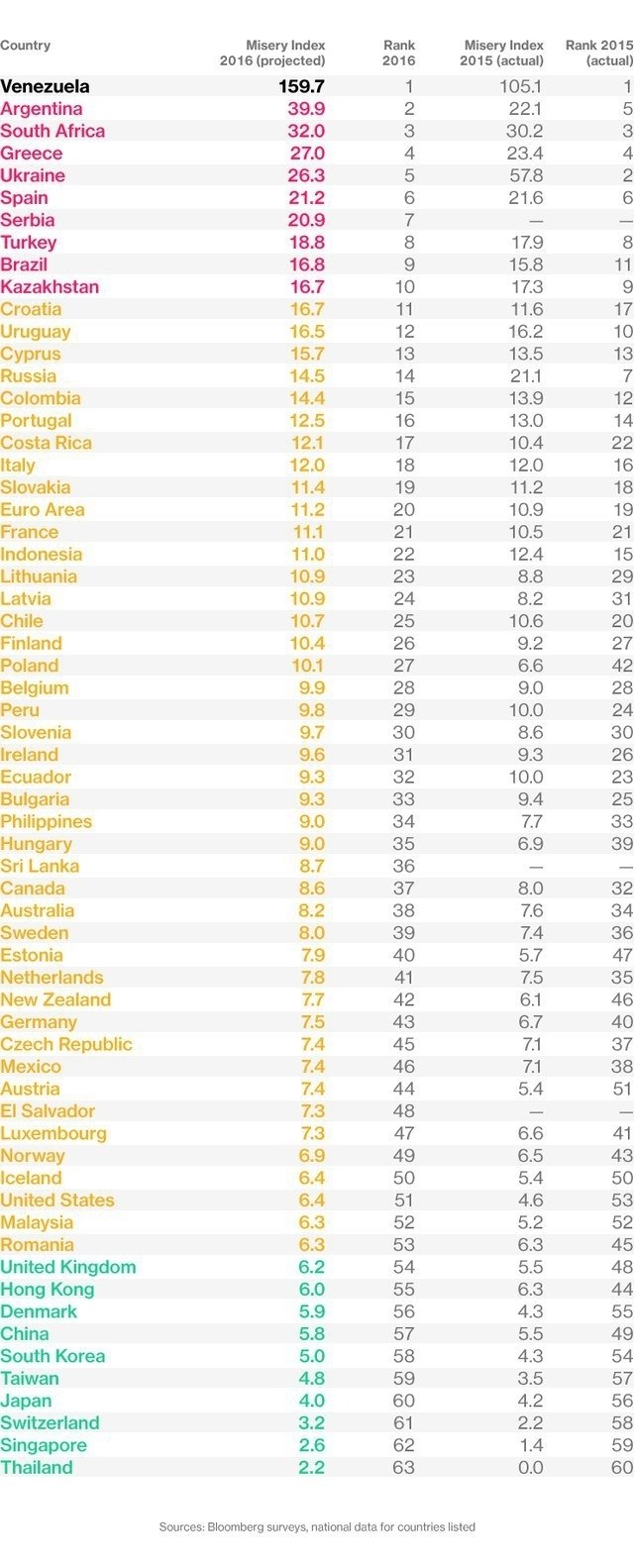 Другою у рейтингу 2015 року видання поставило Україну. Своїх розрахунків воно не публікує, але, за офіційними даними, інфляція в Україні склала 43,3%, а рівень безробіття за 9 місяців - 9,4%.