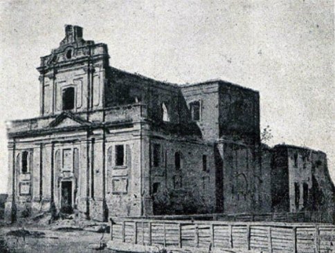 Почали будувати цей костел у 1741 році. Будівля була виконана у бароковому стилі. Пожежа пошкодила костел і у 1764 році він був відновлений. У 1845 році знову пожежа. На цей раз знищує костел назавжди. Руїна стояла ще декілька років, аж доки її не розібрали. Ділянку згодом віддали для потреб лютеранської громади. У 1906 році тут почали будувати кірху.