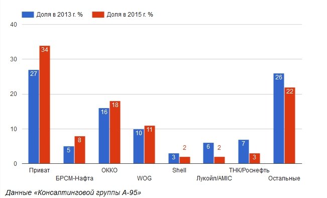 Зокрема, у 2013 році частка мережі АЗС «Привату» по Україні становила 27%, в 2015-му вона зросла до 34%.