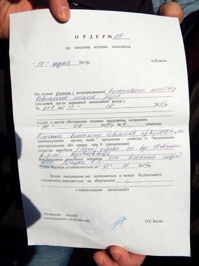 Колишній депутат Ковельської міської ради Роман Ляшук пояснює, що дерева ріжуть на приватній земельній ділянці цілком законно, і демонструє ордер на знесення зелених насаджень, який, як бачимо, давно не дійсний.