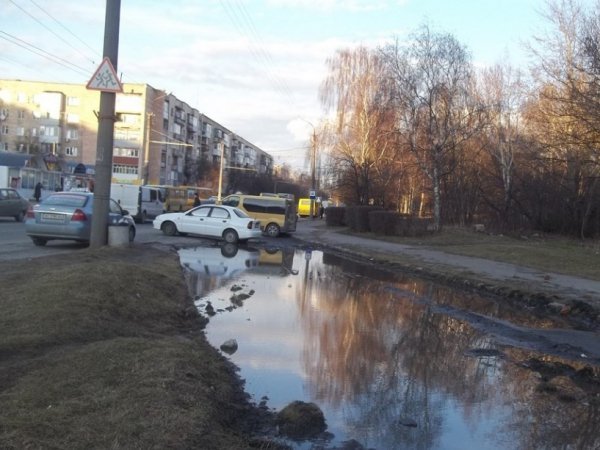 Очевидно, винна у цьому важка будівельна техніка, яка наробила котлованів. Як результат, під час відлиги здоровезна яма наповнилася водою, яка нікуди не дівається.