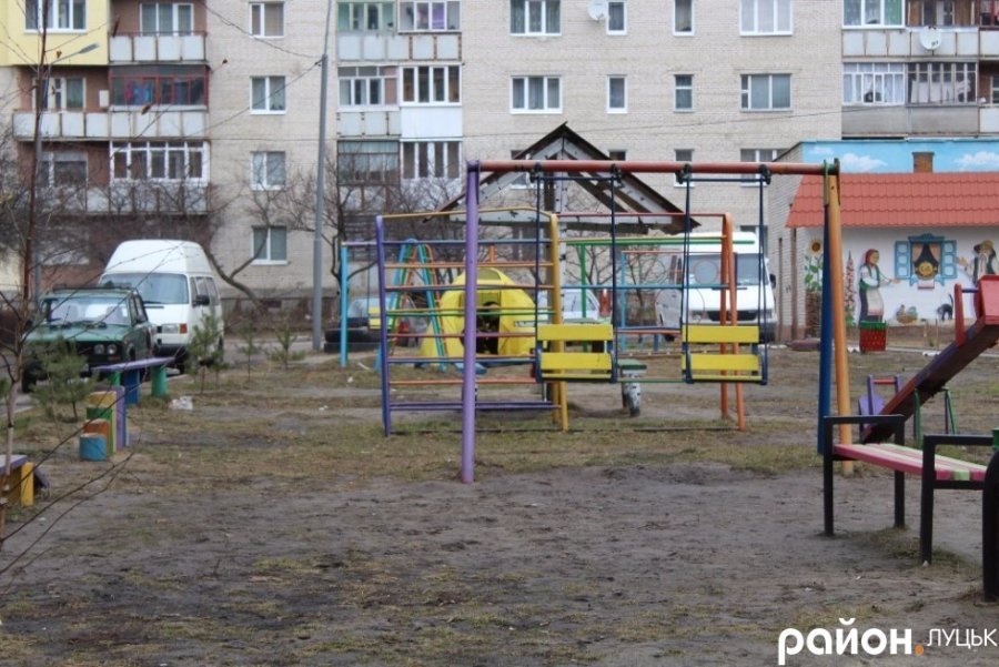 Художник оформив і дитячий майданчик: колеса з автомобілів перетворилися на кольорові клумби, в яких улітку висаджують квіти.