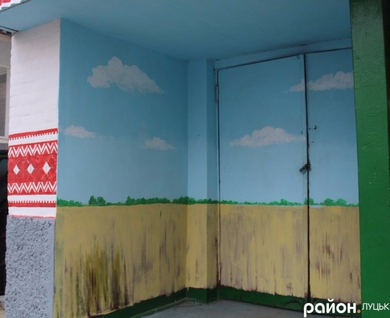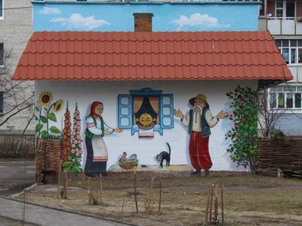 На одній зі стін багатоповерхівки зображено підводний світ, на іншій будівлі – персонажі з казки «Коза та семеро козенят». Ще на одній намальовані Колобок, дід та баба. Є й персонажі з відомого мультфільму про козаків.
