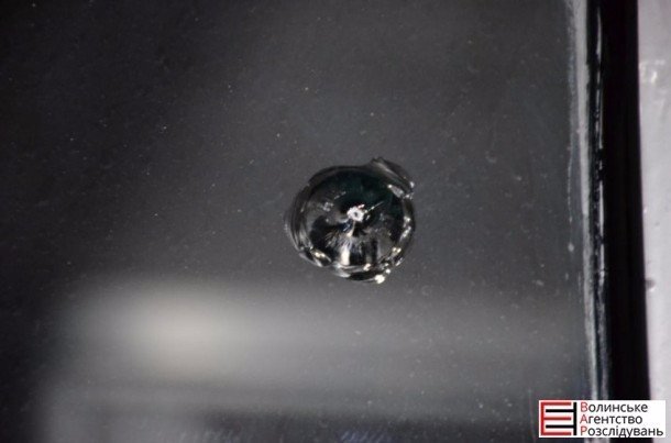 Дійсно – на скляній частині дверей видніється дірка від кулі,у коридорі лежать шматочки скла. Поряд – інші сліди від пострілів