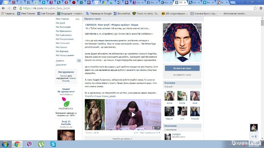 Ми повідомляли, що 1 жовтня у Луцьку урочисто відкрили перший в Україні пам'ятник Андрію Кузьменку, який у лютому 2015 року трагічно загинув у ДТП. Після відкриття почалось обговорення: багатьом не сподобався "бронзовий" Скрябін. На думку багатьох, він зовсім не подібний на справжнього музиканта.