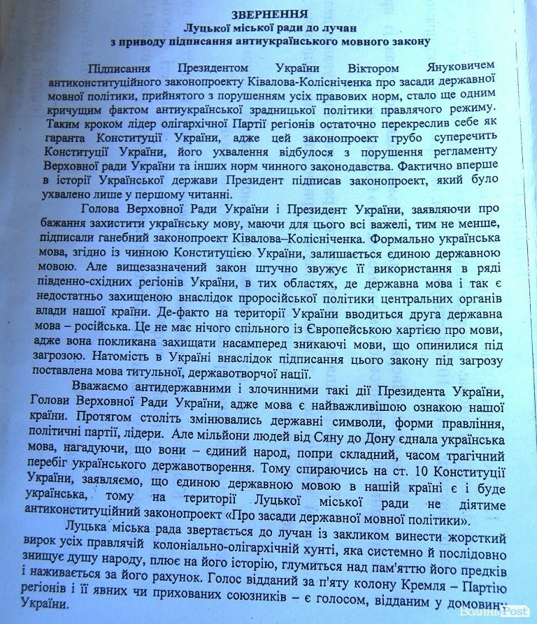 «У зв’язку із підписанням Президентом України Януковичем В. Ф. ухваленого Верховною Радою України законопроекту «Про засади державної мовної політики», яким спровоковано загрози громадянському спокою суверенітету і територіальній цілісності України… вирішила: громадянам, посадовим і службовим особам, підприємствам, організаціям і установам при реалізації державної мовної політики у м. Луцьку застосовувати статтю 10 Конституції України, як нормативний акт прямої дії…» – йдеться у рішенні.