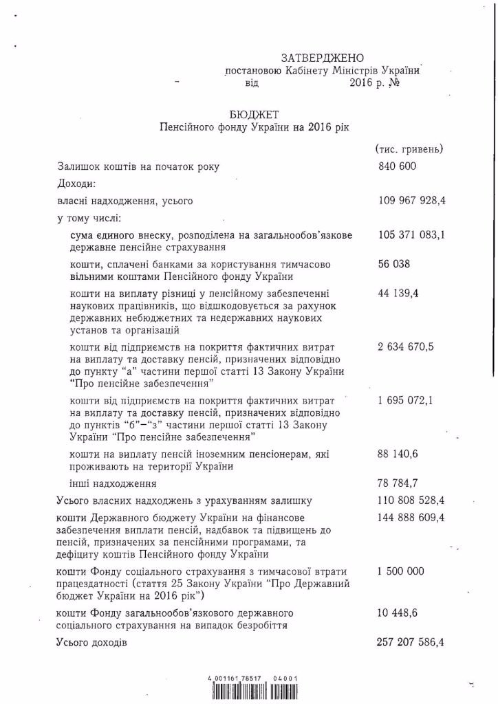 Кабінет міністрів схвалив бездефіцитний бюджет Пенсійного фонду на 2016 рік, в який закладені доходи на рівні 257,2 млрд гривень, та витрати – 256,4 млрд гривень.