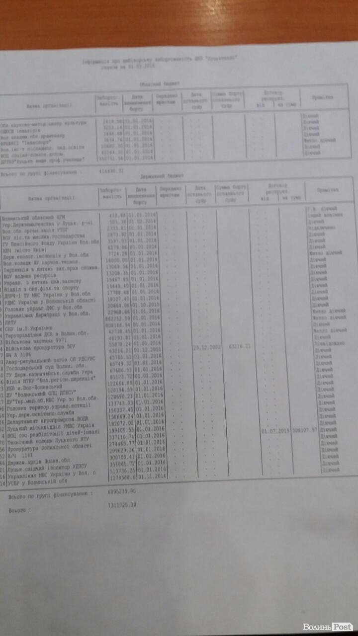 В свою чергу, підприємство боргує НАК "Нафтогаз" 53 мільйони гривень, ПАТ "Волиньобленерго" - 2,5 мільйона гривень, "Водоканал" 875 тисяч гривень.