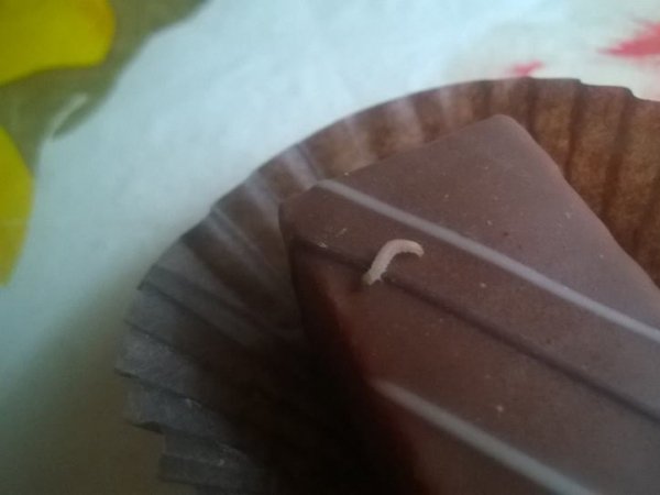 З того часу, як їх придбав, зберігав в холодильнику. Відкрили на днях, до кави, і тут бац, білі друзі хробачки. Будьте уважні часом те, що може попастися з цукерками, геть не солодощі" - йдеться в дописі.