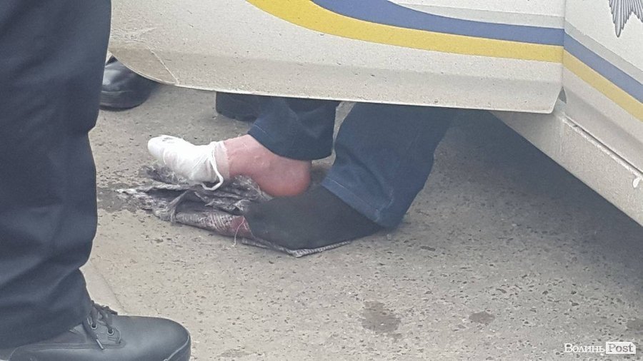 Зараз лікарі "швидкої" оглядають поранену ногу дебошира. Чоловік голосно лається і вимагає горілки. Його везтимуть в наркодиспансер. Запевняє, що алкоголь не вживав, лише коноплю.