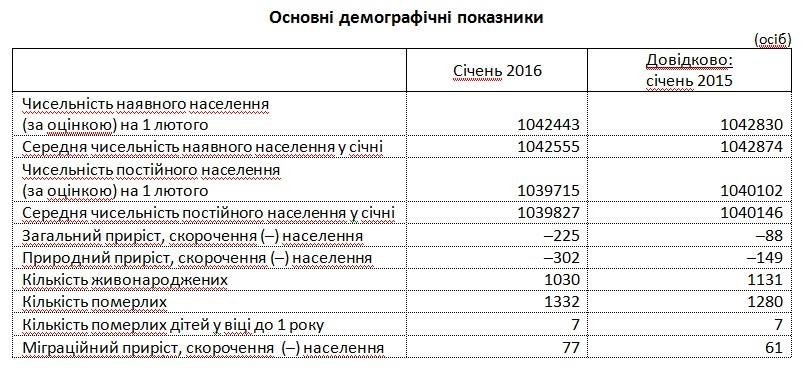 "Упродовж січня 2016р. чисельність населення зменшилася на 225 осіб. Зменшення чисельності населення області відбулося за рахунок природного скорочення – 302 особи, водночас зафіксовано міграційний приріст населення – 77 осіб", - йдеться у повідомленні.