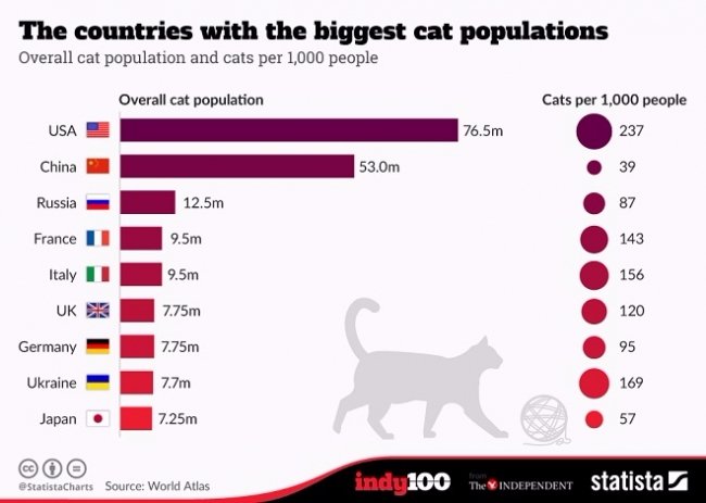 Відповідно до даних, Китай йде на другому місці після США. У Китаї проживає 53 млн кішок. Потім йде Росія, де живе 12,75 млн кішок і Бразилія, в якій нарахували 12,5 млн кішок.
